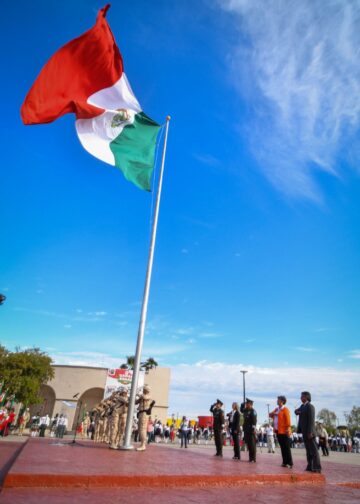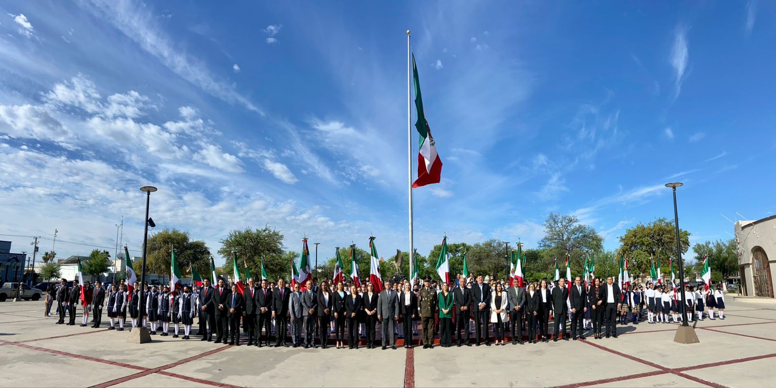 En el evento que se realizó en la Macro Plaza, frente al asta bandera, participaron la “Banda de Guerra Oro”, la escolta “Panteras” de la escuela primaria “Miguel Hidalgo”, y la escolta del 12avo. Regimiento de Caballería Motorizado de Piedras Negras, en los honores a la bandera los integrantes de la escolta del Ejército Mexicano izaron la bandera nacional.