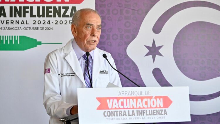Torreón, Coahuila de Zaragoza; a 14 de Octubre de 2024.- El Secretario de Salud, Eliud Aguirre Vázquez, arrancó la Campaña Estatal de Vacunación contra la Influenza en Torreón con una meta de 960 mil dosis en esta temporada.