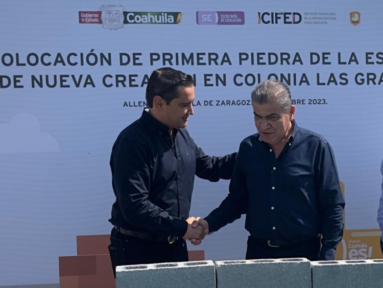 El Mandatario estatal, junto al Alcalde de Allende, José Díaz González, y el Secretario de Educación de Coahuila, Francisco Saracho Navarro, colocaron la primera piedra de la Escuela de Nueva Creación en la Colonia Las Granjas, en donde se invertirán 5 millones de pesos, evento en donde reconoció la labor de docentes y padres de familia para construir juntos un mejor futuro para las niñas y niños coahuilenses.