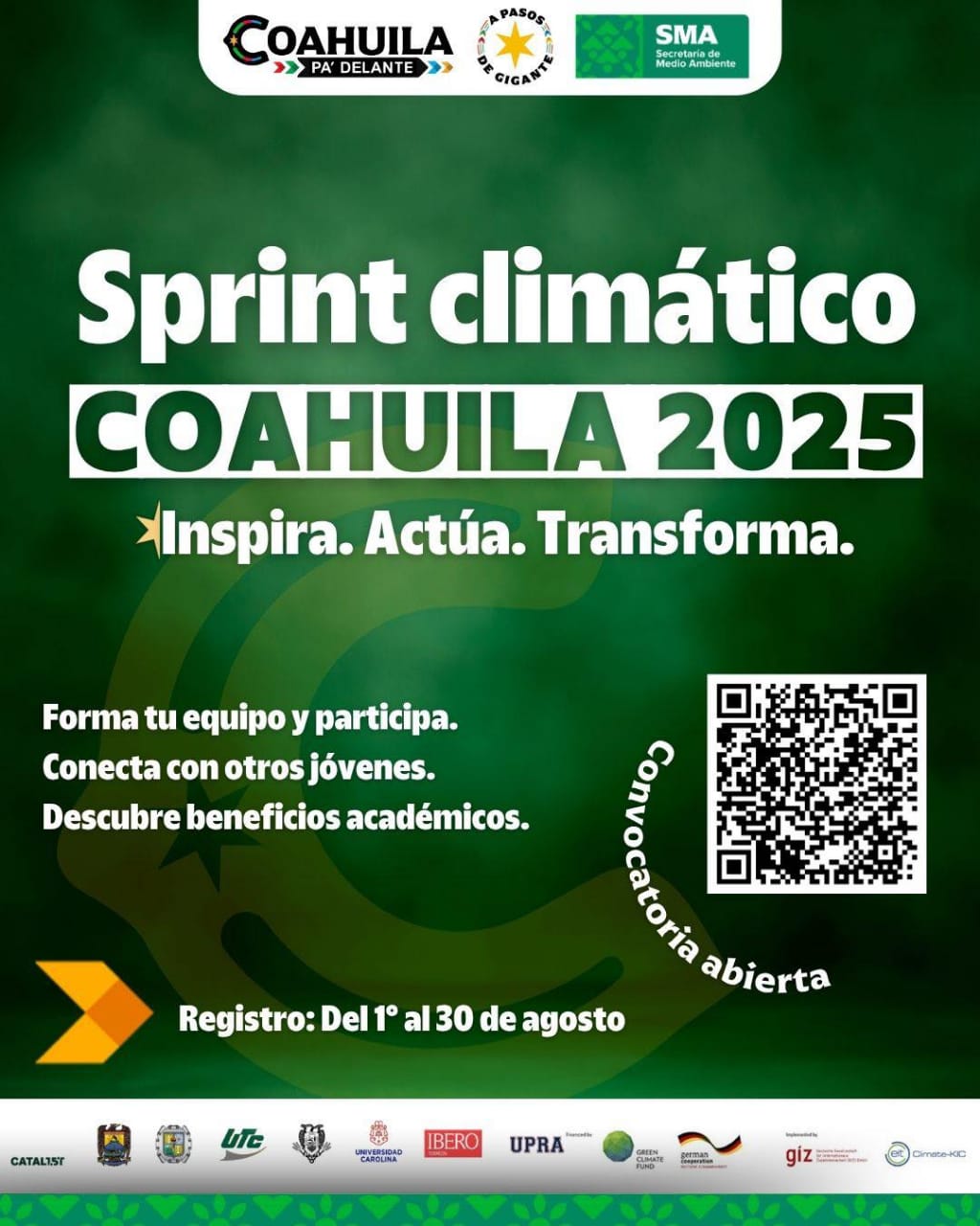 Saltillo, Coahuila de Zaragoza, 14 de agosto del 2025.- La Secretaría de Medio Ambiente del Estado de Coahuila, en coordinación con la Universidad Tecnológica de Coahuila, Universidad Carolina, Universidad Autónoma de Coahuila, Universidad Politécnica de Ramos Arizpe, Universidad Autónoma Agraria Antonio Narro, Universidad Iberoamericana Campus Laguna y el Instituto Tecnológico de Saltillo, con la colaboración de la iniciativa CATAL1.5°T de la Cooperación Técnica Alemana (GIZ) en México, convocan a jóvenes universitarios a participar en el Concurso Sprint Climático.