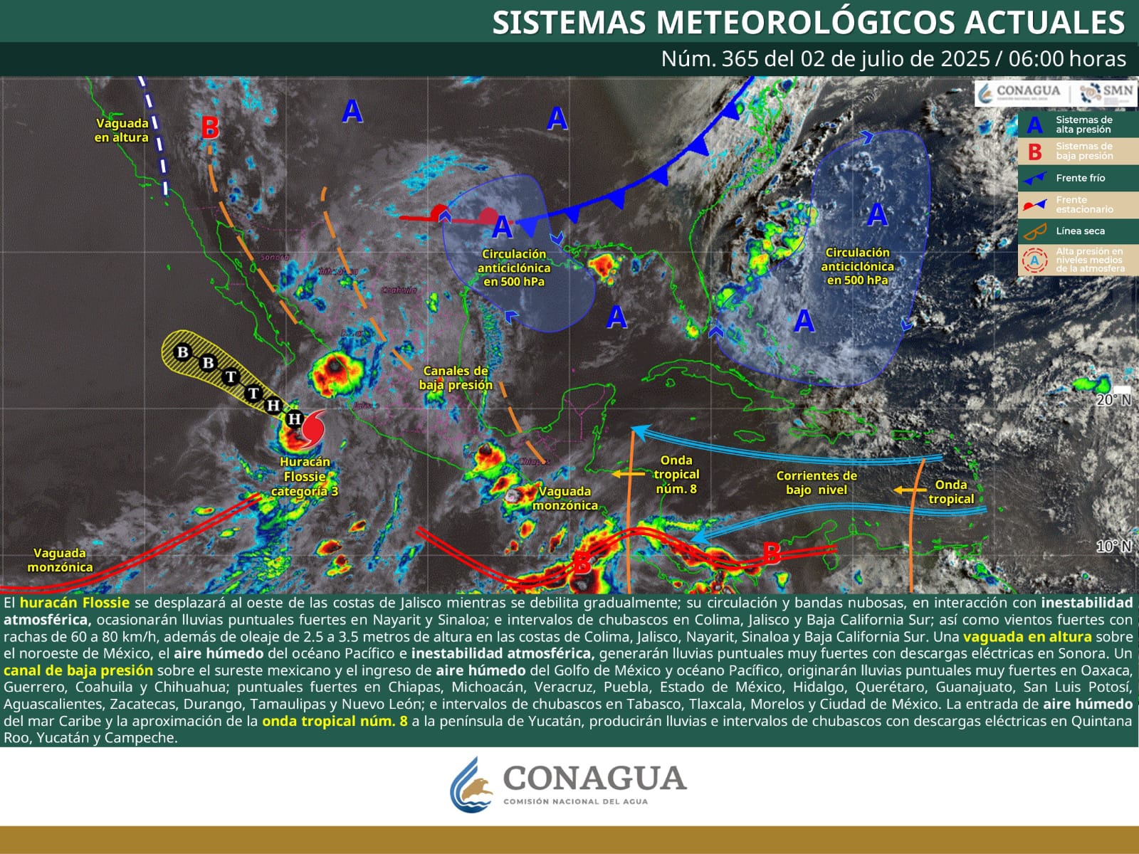 * Lluvias fuertes con puntuales muy fuertes (50 a 75 mm) en las cinco regiones del estado, acompañadas de descargas eléctricas y posible caída de granizo. Estas condiciones podrían incrementar los niveles de ríos y arroyos, así como generar encharcamientos, deslaves e inundaciones.