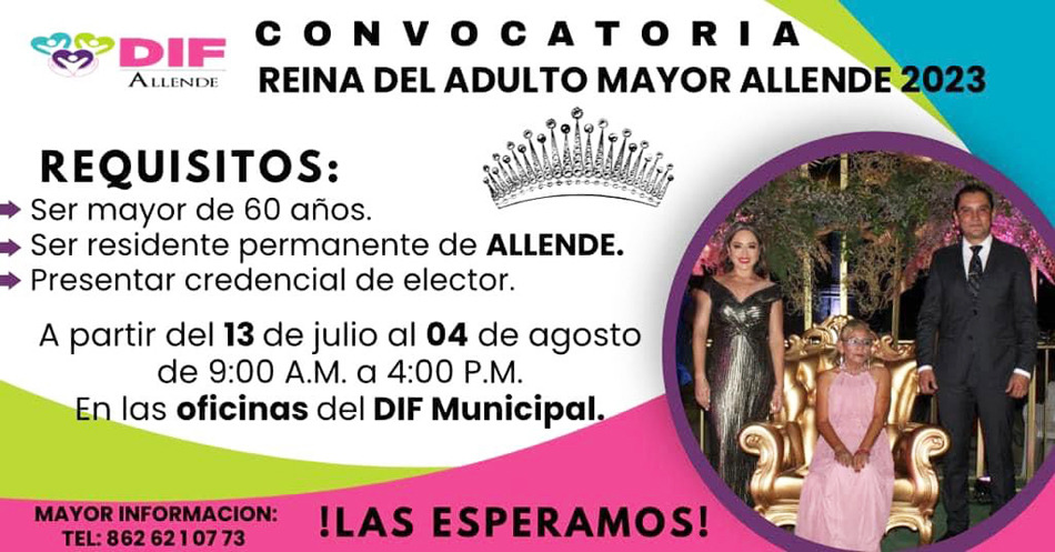 Allende, Coahuila; a 21 de julio de 2023.- El DIF Municipal de Allende que preside Laura Cristina Saldívar Hernández, lanzó la convocatoria para elegir a la Reina del Adulto Mayor Allende 2023, un evento que se realizará en el marco de las celebraciones del mes de agosto.