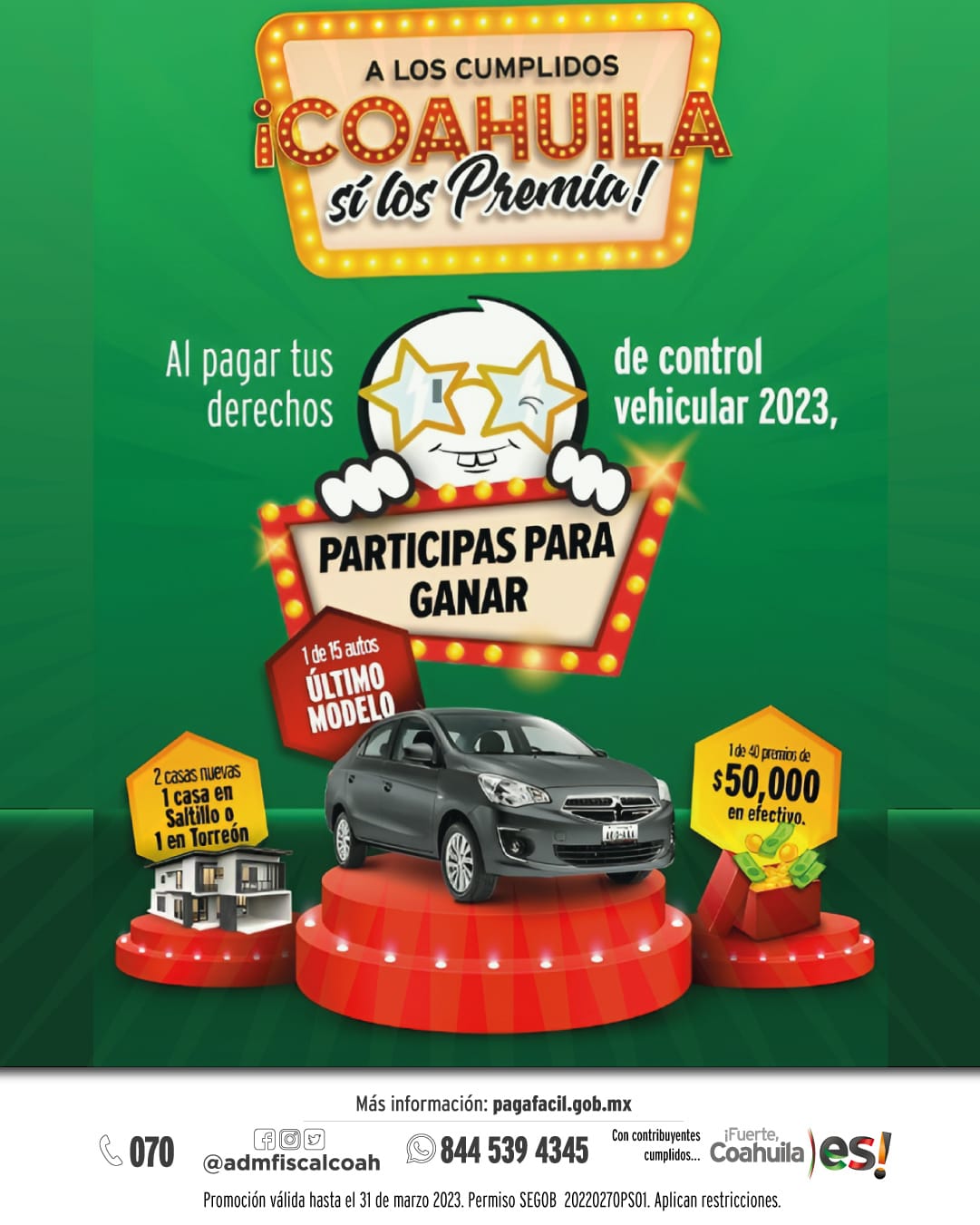Si realizaste tu Prepago 2023 en el mes de diciembre o cubres tu control vehicular 2023 antes del 31 de marzo, participas automáticamente en el sorteo que año con año se ha realizado, “A los cumplidos Coahuila sí los premia”. Participa por increíbles sorpresas, como una de dos casas nuevas en Torreón o Saltillo, uno de 15 autos último modelo o uno de 40 premios de 50 mil pesos.