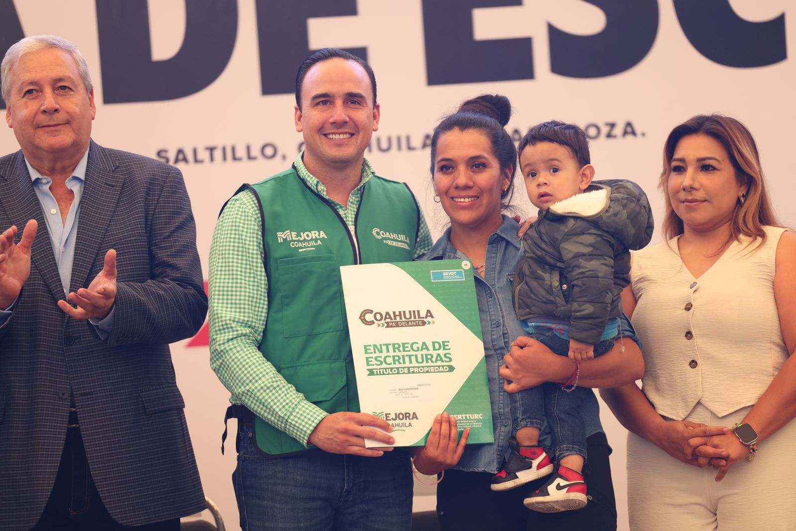 En Saltillo y acompañado por el alcalde José María Fraustro Siller y el alcalde electo Javier Díaz González, Manolo Jiménez entregó 568 escrituras a habitantes de la capital del estado, y agradeció a Ángel Mahatma Sánchez, secretario de Vivienda y Ordenamiento Territorial, así como al equipo Mejora, por hacer posible esta entrega simultánea.