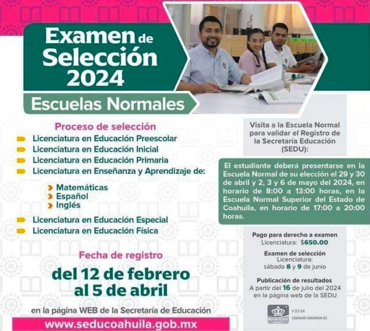 Agregó, que el 5 de abril cierra el registro en la página web de la Secretaría de Educación www.seducoahuila.gob.mx y el examen de selección está programado para los días 8 y 9 de junio.