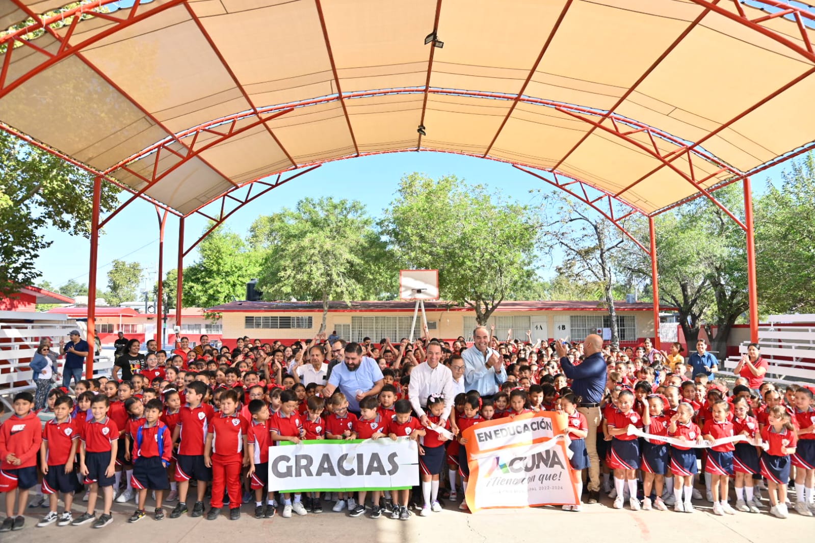 Ante 403 alumnos de la primaria Cinco de Mayo, de la directora Eva Ramírez Alvarado, 13 docentes, 1 profesor de educación física, 1 de artística y de 2 trabajadores manuales, la Administración Municipal, a través de las direcciones de Educación y Obras Públicas, entregó techo malla sobra rehabilitado.