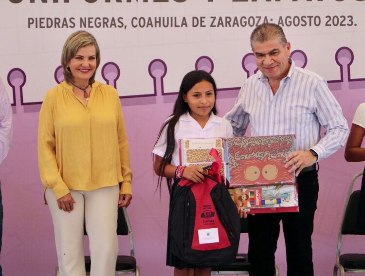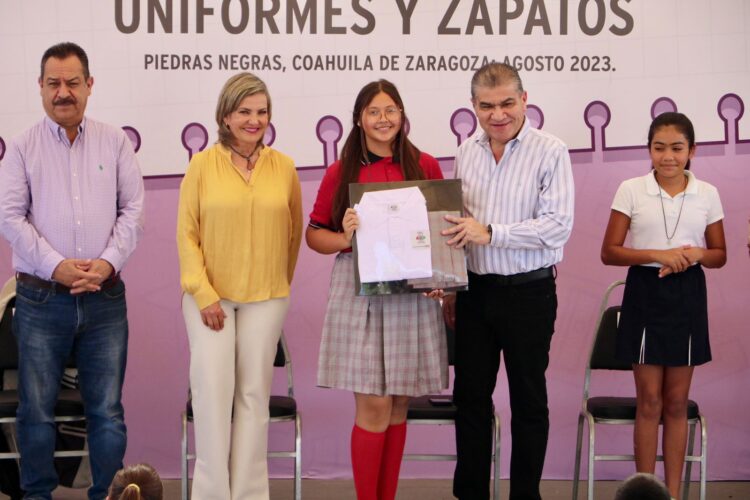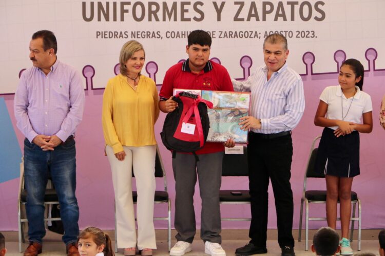 En el marco del inicio del ciclo escolar 2023-2024, el Gobernador del Estado Miguel Ángel Riquelme Solís y la Alcaldesa Norma Treviño Galindo entregaron paquetes de útiles escolares, uniformes y zapatos a 142 estudiantes de educación básica de la zona rural de Piedras Negras.