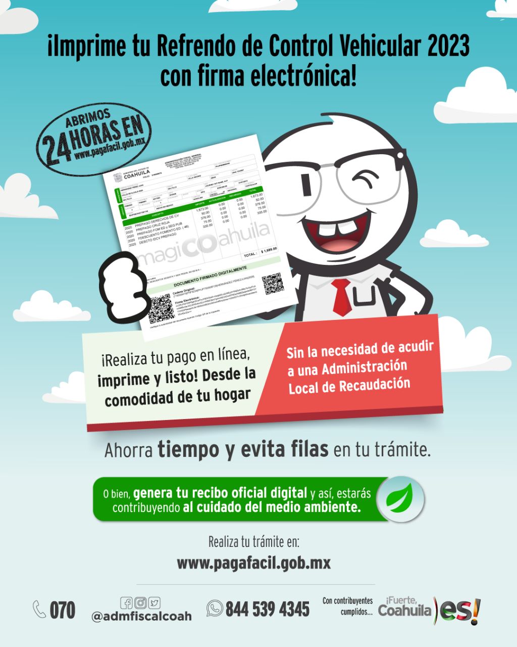 Entra al portal web: www.pagafacil.gob.mx, consulta tu adeudo, paga en línea e imprime tu Refrendo 2023 y listo, tendrás tu documento digital con validez oficial a la mano, desde la comodidad de tu casa, oficina o celular, por lo que es un proceso rápido al poder realizar el pago de tu control vehicular 2023 completamente en línea.