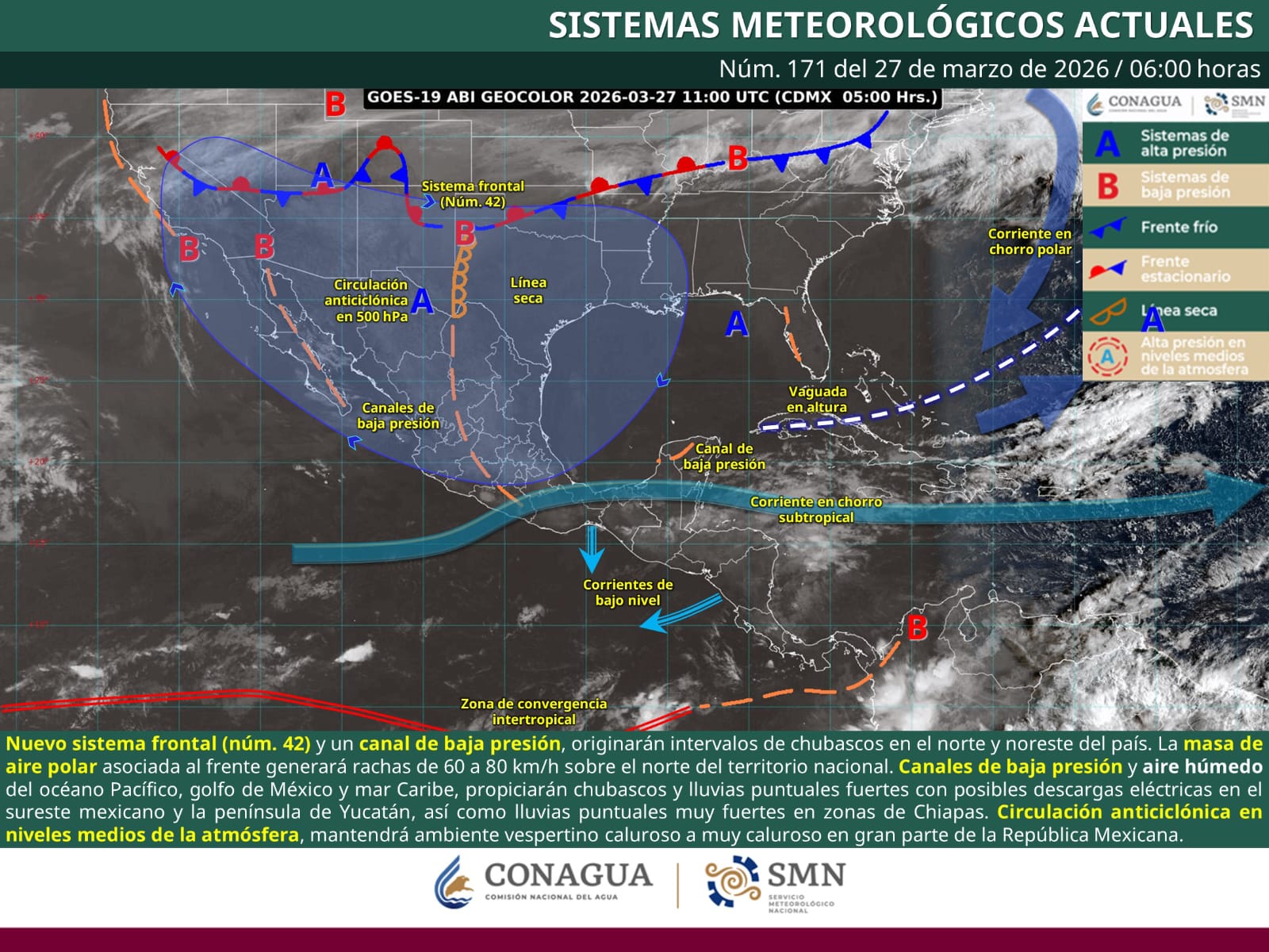 Saltillo, Coahuila de Zaragoza; 27 de marzo de 2026.– La Secretaría de Gobierno, a través de la Subsecretaría de Protección Civil del Estado, informa que el ingreso del frente frío número 42 al norte del país, en interacción con una masa de aire polar, generará condiciones de inestabilidad en la entidad.