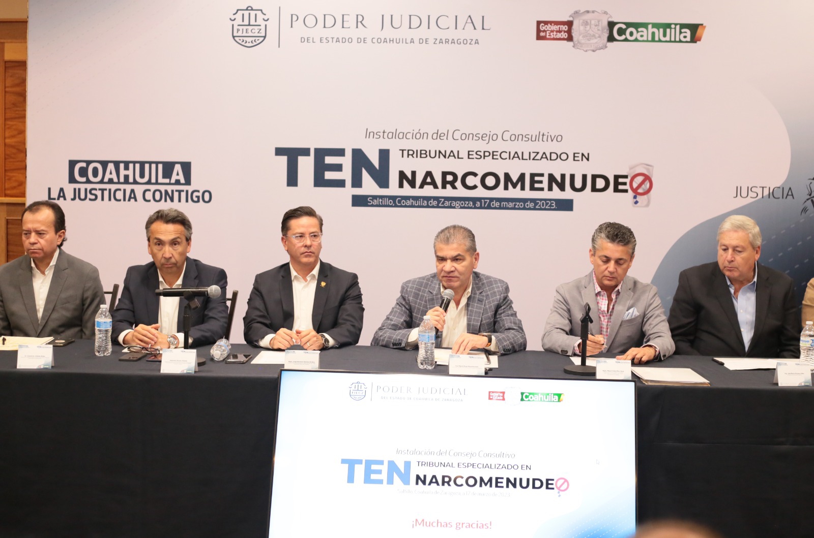 “Al dar inicio al Tribunal Especializado en Narcomenudeo (TEN), que en algunos lados han sido llamados tribunales de adicciones, programas de justicia terapéutica, y que incluyen también la visión de justicia restaurativa de trabajo comunitario bajo un enfoque donde el modelo que se plantea es la recuperación y la reintegración a la sociedad de quienes consumen estupefacientes, significa sin duda un avance importante en la consolidación del modelo de justicia para Coahuila, pero también resultado del compromiso del Estado en su conjunto por brindar seguridad, paz y justicia, que ha llevado al reconocimiento nacional e internacional bajo el liderazgo del gobernador Miguel Riquelme”, indicó.