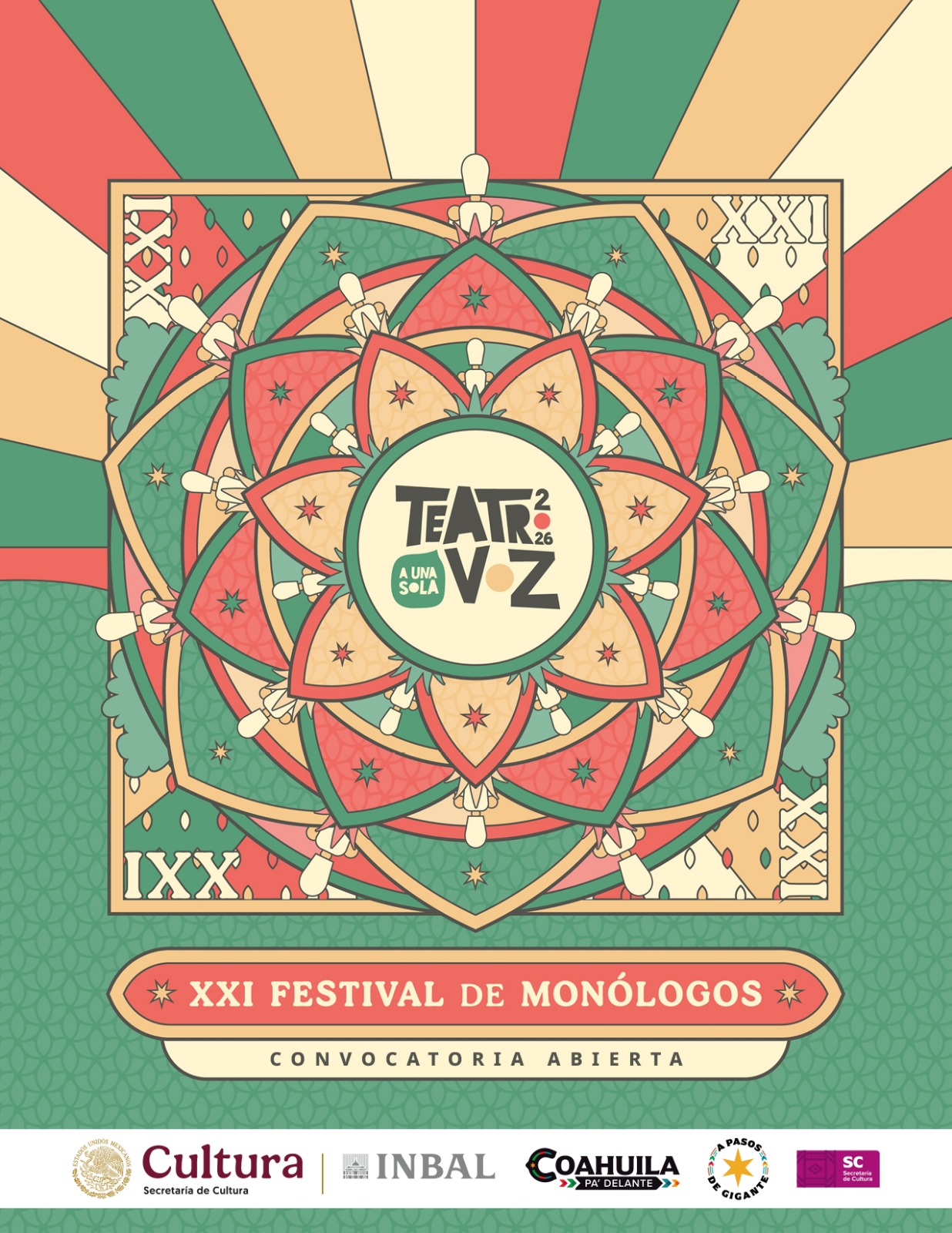 Por su parte, el XXI Festival de Monólogos: Teatro a Una Sola Voz tiene como finalidad articular una programación de propuestas escénicas unipersonales que circularán por 21 sedes en 20 estados del país, distribuidas en tres circuitos: Norte, Centro-Occidente y Centro-Sureste. Cada montaje seleccionado realizará siete funciones durante su recorrido correspondiente. Las puestas en escena elegidas recibirán un premio de 63 mil pesos y la programación estará integrada por 21 producciones que acrediten solidez artística, pertinencia social, innovación en sus procesos creativos y calidad técnica. El Circuito Norte se llevará a cabo del 17 de junio al 5 de julio.