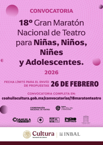 Saltillo, Coahuila, a 20 de febrero de 2026.– El Gobierno del Estado de Coahuila a través de la Secretaría de Cultura realiza dos importantes convocatorias para el área de teatro, en coordinación con la Secretaría de Cultura Federal, a través del INBAL y la Coordinación Nacional de Teatro, en las que se invita a compañías teatrales y creadoras y creadores escénicos del estado a participar en el 18º Gran Maratón Nacional de Teatro para Niñas, Niños y Jóvenes, en el marco del Día Mundial del Teatro para la Infancia y la Juventud, y el XXI Festival de Monólogos: Teatro a Una Sola Voz.