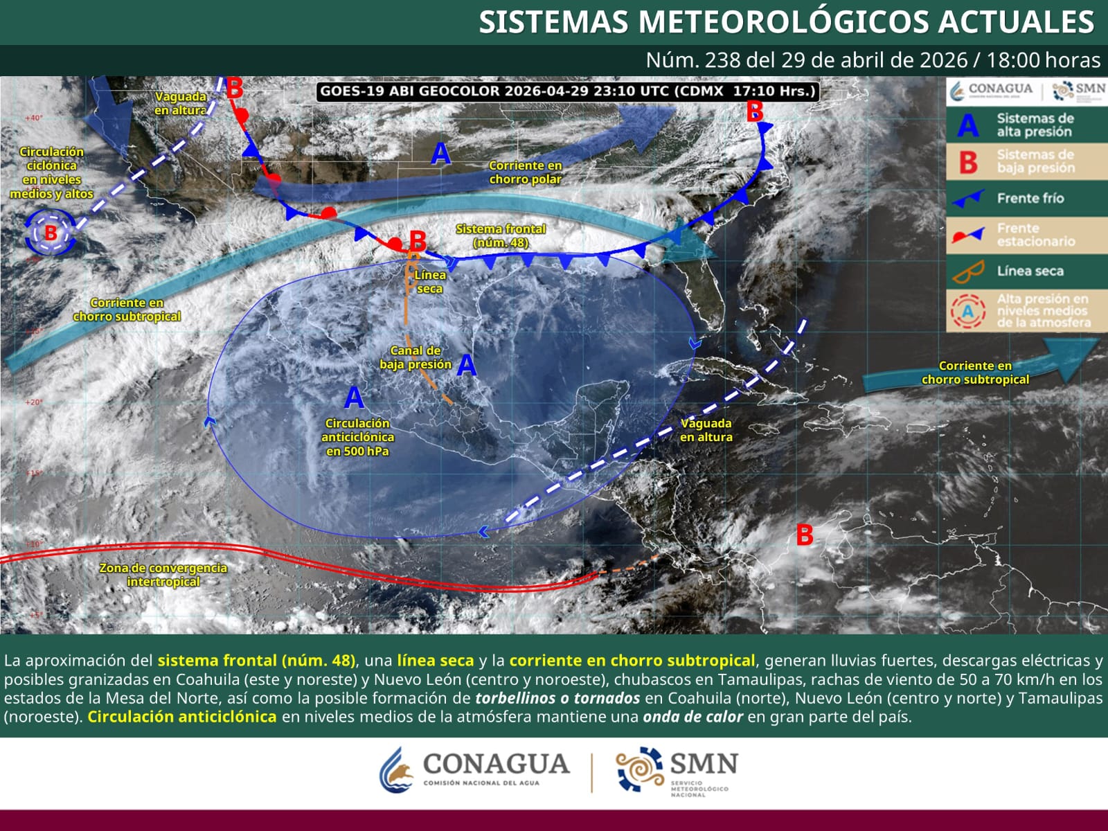 Saltillo, Coahuila de Zaragoza; 30 de abril de 2026.– La Secretaría de Gobierno, a través de la Subsecretaría de Protección Civil del Estado, informa que la interacción de diversos sistemas meteorológicos, entre ellos un canal de baja presión, inestabilidad atmosférica, una vaguada en altura, la corriente en chorro subtropical y el frente frío número 48, que se desplazará sobre el norte y noreste del país, favorecerá lluvias fuertes, descargas eléctricas y posible caída de granizo en distintas regiones de Coahuila.