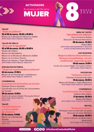 La Secretaría de Cultura invita a las familias coahuilenses a consultar la cartelera completa y participar en esta programación que celebra la historia de los espacios culturales, impulsa la creación artística y reafirma el compromiso del Gobierno del Estado con la cultura como motor de transformación social.