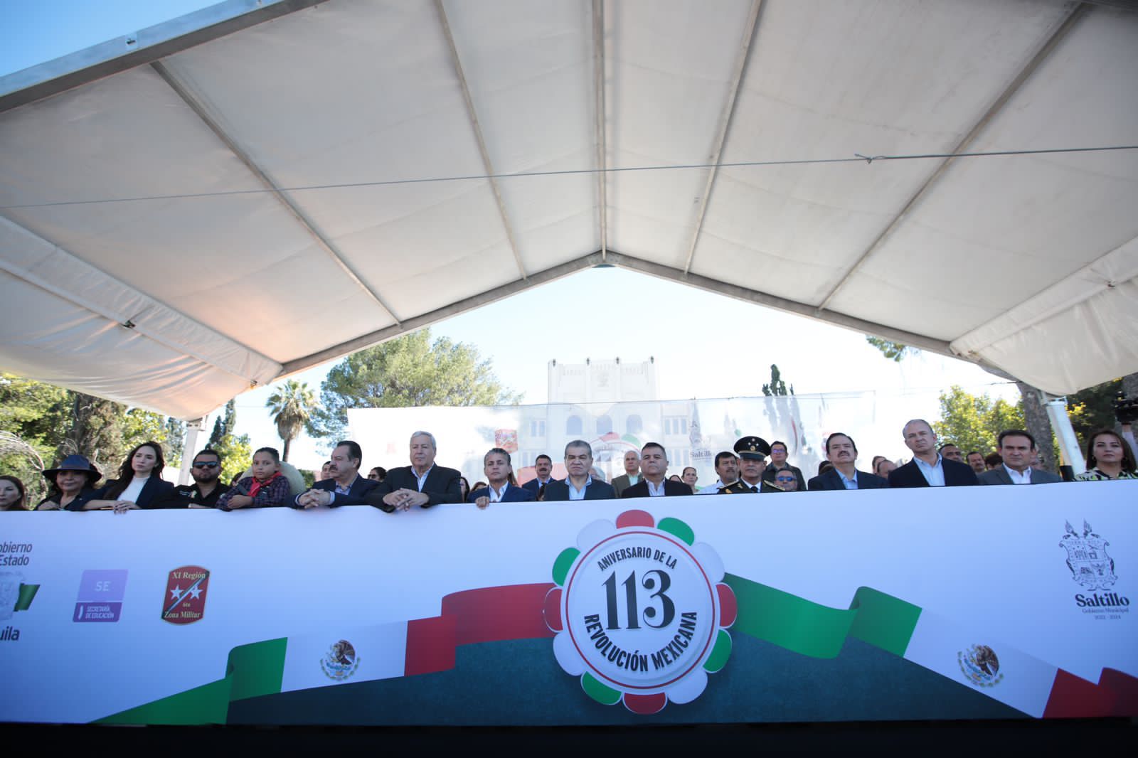 Saltillo, Coahuila de Zaragoza; a 20 de Noviembre de 2023.- El gobernador Miguel Ángel Riquelme Solís encabezó desde el presídium el desfile cívico deportivo conmemorativo al 113 Aniversario del inicio de la Revolución Mexicana, en el que estuvo acompañado por Eduardo Olmos Castro, diputado Presidente de la Junta de Gobierno del Congreso del Estado, y Miguel Felipe Mery Ayup, magistrado Presidente del Tribunal Superior de Justicia, así como de José María Fraustro Siller, Alcalde de Saltillo.