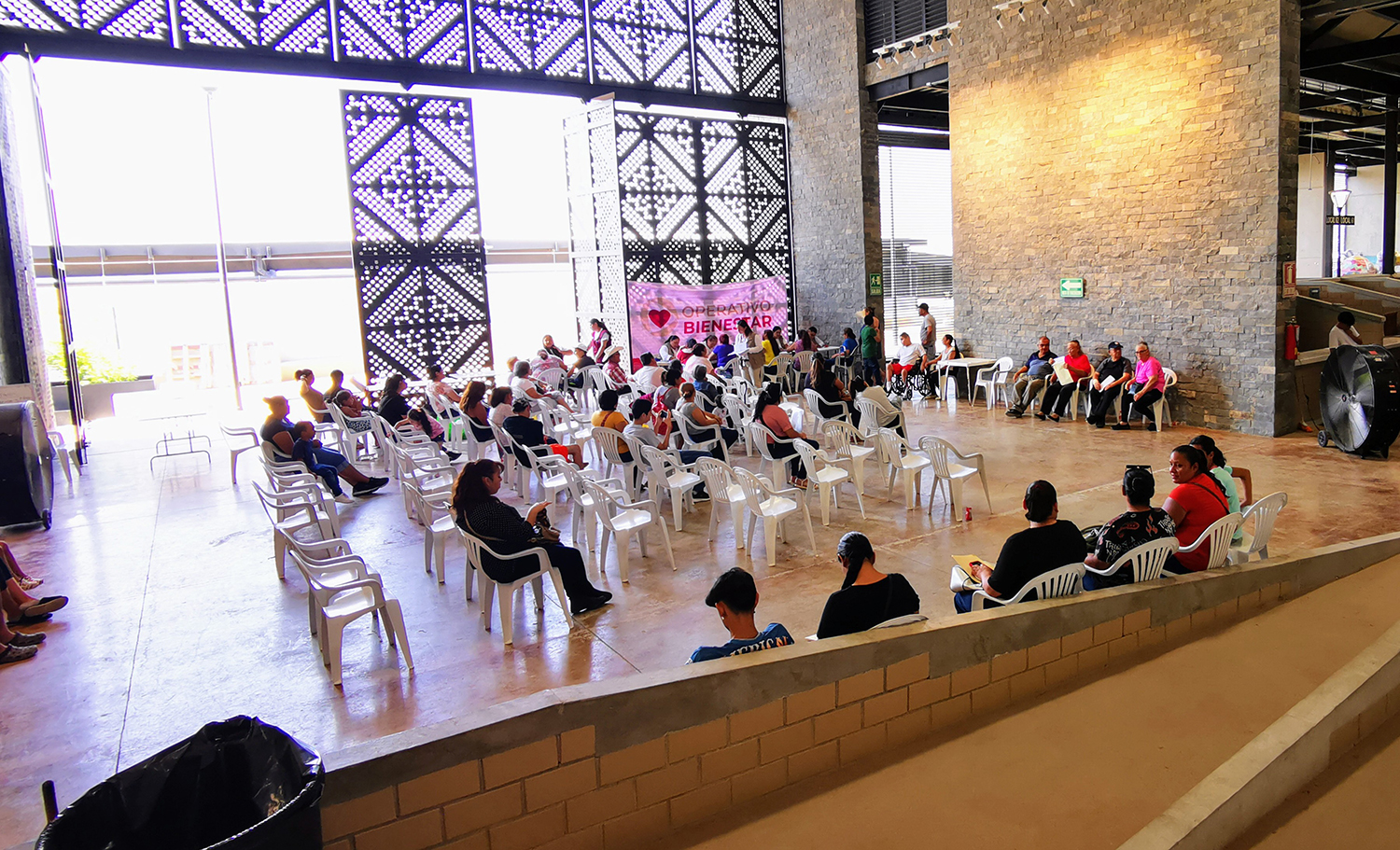 Lilia Vicente, aclaro que no es necesario acudir al Banco del Bienestar a cobrar exclusivamente el día que les toca, de acuerdo a su primera letra del apellido, ya que el dinero no se perderá y allí estará para que puedan ir días después para evitar largas filas y el riesgo de desmayos por el intenso calor-