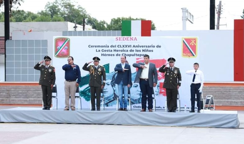 Ceremonia realizada en la explanada de la plaza Benjamín Canales, con la presencia de alumnos de la Secundaria Luis Donaldo Colosio Murrieta, funcionarios públicos y miembros del cabildo, en la que rindieron honores al lábaro patrio y se pasó lista de honor a los Niños Héroes del 13 de septiembre de 1847.