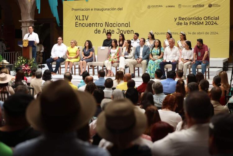 Aguascalientes, Aguascalientes; a 14 de abril de 2024.- En el marco de las actividades de la Feria Nacional de San Marcos 2024, en la que Coahuila es el estado invitado, el gobernador Manolo Jiménez Salinas acompañó a Tere Jiménez, gobernadora de Aguascalientes, en la premiación e inauguración del XLIV Encuentro Nacional de Arte Joven, evento en el que el mandatario de Coahuila señaló que estas dos entidades estrechan su relación económica y cultural.