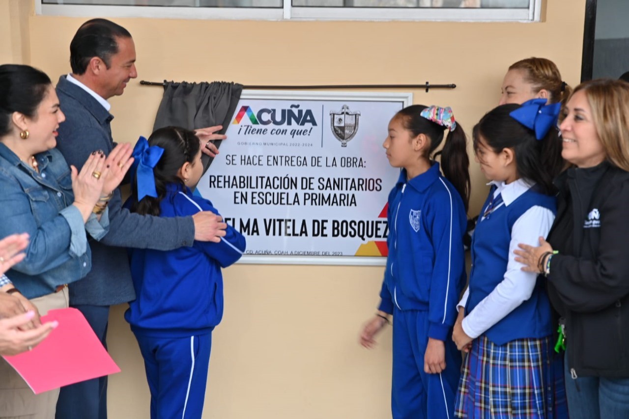 Acuña Coah. – “Vamos a seguir apostándole a la educación y apoyando a niños y jóvenes” afirmó el alcalde Emilio de Hoyos Montemayor al encabezar jornada de entrega de obra de rehabilitación de módulos sanitarios en la escuela primaria Anselma Vitela de Bósquez.