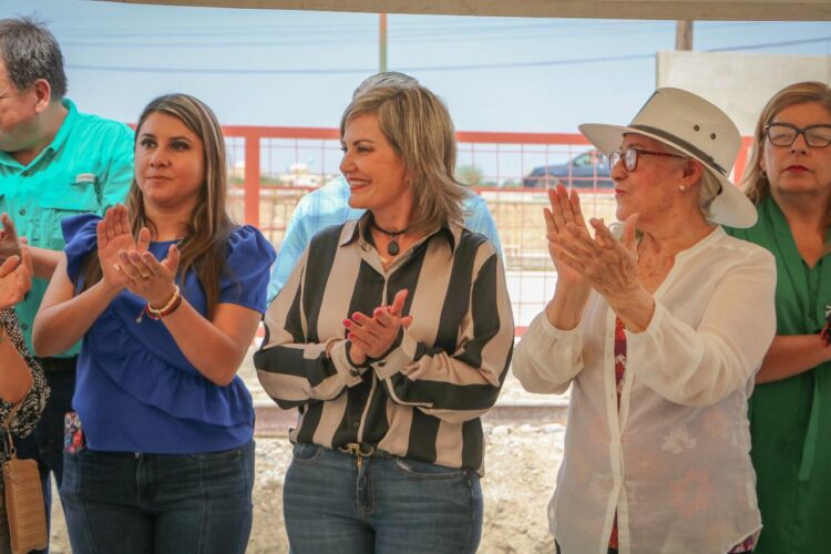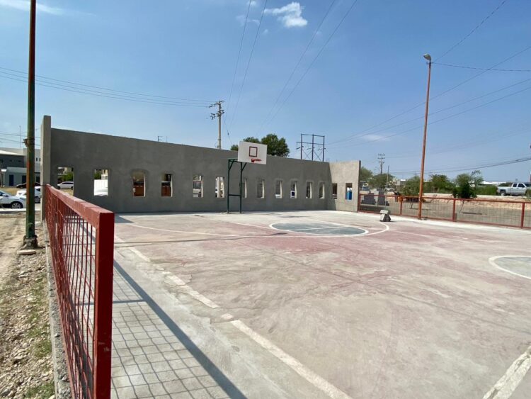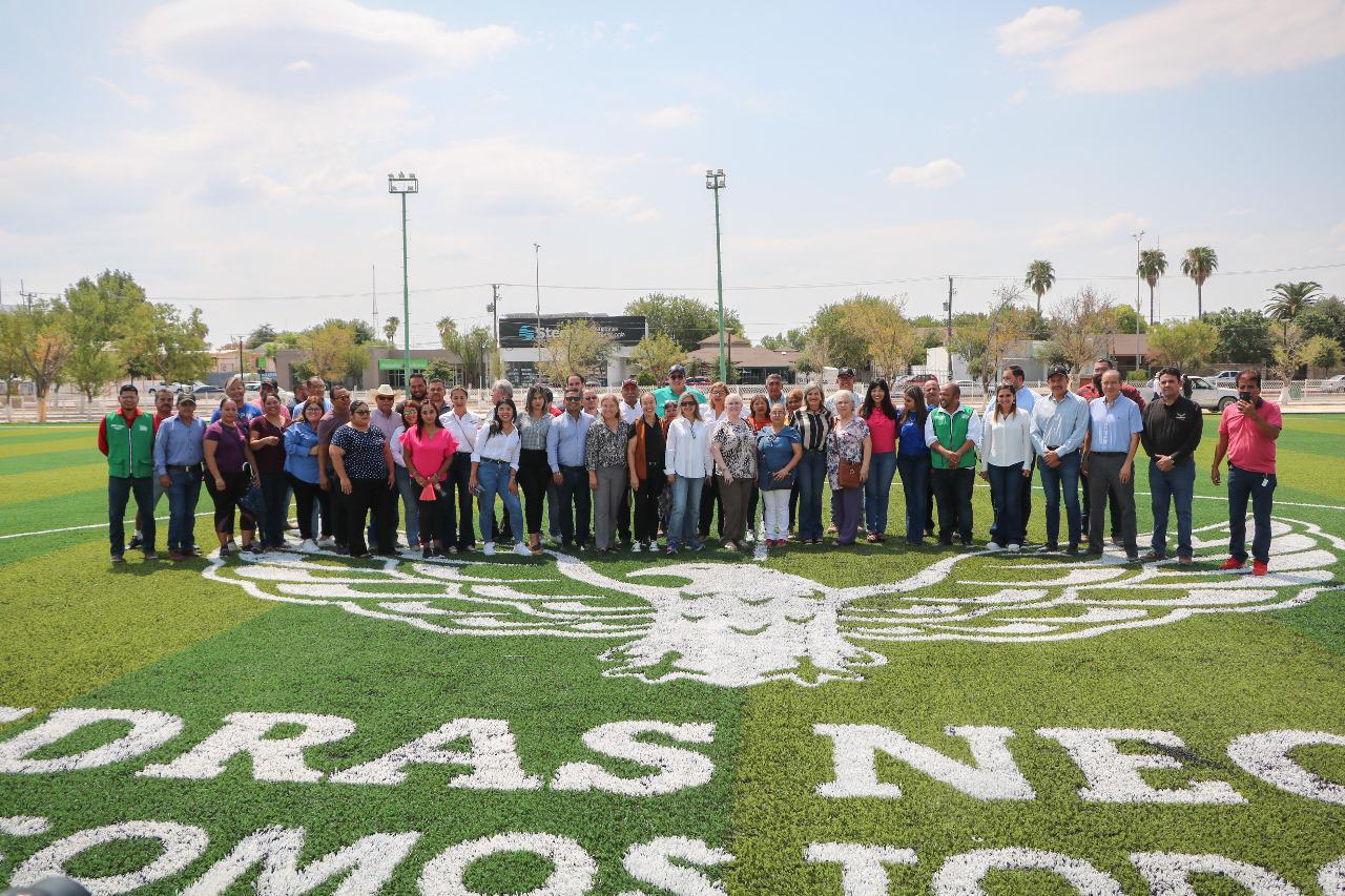 Acompañada por regidores y síndicos del Cabildo, funcionarios municipales y vecinos de las zonas beneficiadas, en primer término, Treviño Galindo constató el progreso de 50 por ciento en la construcción de una cancha de pasto sintético en la colonia Guillén, obra que incluirá área de gradas y una trota pista.