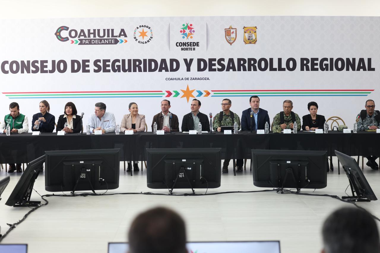 Ciudad Acuña, Coahuila de Zaragoza; a 12 de marzo de 2026.- Al encabezar la reunión del Consejo de Seguridad y Desarrollo Regional en Acuña, el gobernador Manolo Jiménez Salinas dio a conocer que ha mantenido este tipo de encuentros en todas las regiones del estado para revisar, junto con miembros de la iniciativa privada, la sociedad civil, representantes de las fuerzas de seguridad y alcaldes y alcaldesas, los indicadores de orden y seguridad, Coahuila global e infraestructura sostenible.