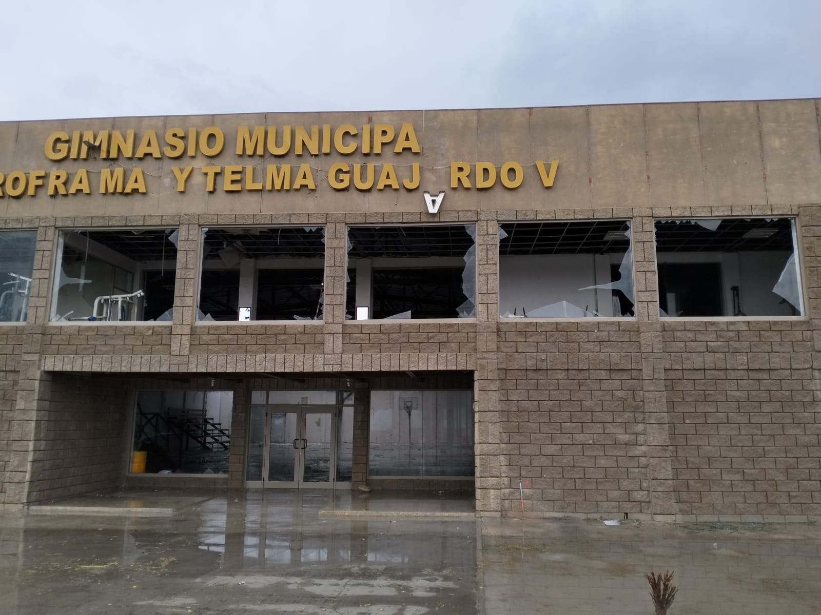 El gimnasio municipal también resultó afectado: perdió todas sus ventanas y sufrió daños en parte del techo, donde las fuertes rachas de viento arrancaron vigas de acero y láminas. Asimismo, se reportaron daños en los paneles solares del asilo de ancianos, entre otras propiedades.