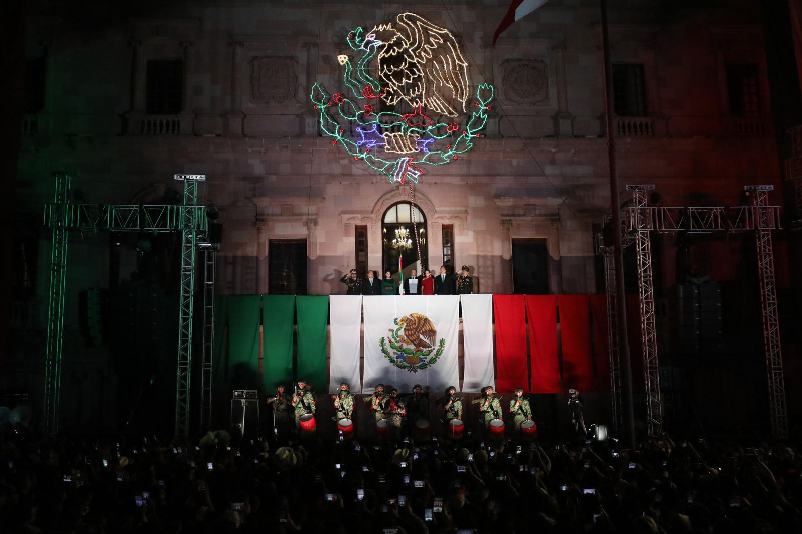 Acompañado en el balcón principal por Paola Rodríguez López, presidenta honoraria de Inspira Coahuila, y flanqueado por los titulares de los poderes Legislativo y Judicial, así como por mandos militares y de instituciones de seguridad estatales, el Jefe del Ejecutivo Estatal en su arenga agradeció y reconoció el trabajo en equipo de las y los coahuilenses, gracias al cual hoy vivimos en un estado seguro, con gran desarrollo y oportunidades.